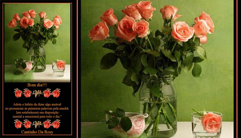 MensagemBom Dia Scraps de Bom Dia FacebookTwitterPinterestWhatsApp Bom dia!!!Adote o hábito de dizer algo amávelao pronunciar as primeiras palavras pela manhã.Isso estabelecerá sua disposiçãomental e emocional para todo o dia."Cantinho Da Rosy